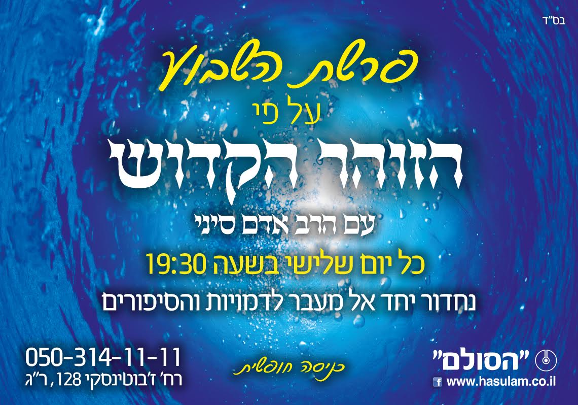 בנוסף, אנו מזכירים לכם שבכל יום שלישי הרב מלמד שיעור בפרשת השבוע על פי הזוהר הקדוש. השיעור פתוח לקהל הרחב ורלוונטי לכולנו. כולכם מוזמנים!