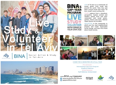 BINA Gap Year - now with COLLEGE CREDIT - for high school graduates. Spend 5 or 10 months living, learning and volunteering in Tel Aviv together with Israeli peers! A few spots left for our fall 2016 cohort! Click for more info or to apply.