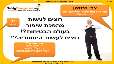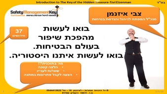בואו לשמוע איך גילוי את המפתח לניהול בטיחות. בואו לשמוע איך מצאנו את "פילוסופיית העל" החדשה לניהול בטיחות! בואו לשמוע איך מצאנו את "מודל מפתח יהלום האביר" , מטריצץת הסיכונים החדשה ועוד...בואו לשמוע על 3 ימי העיון החדשניים שלנו. - סרטון מס' 4