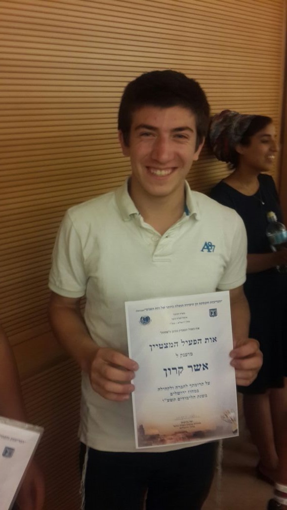 הוא מתנדב בשלווה במשך כל השנה, בלהושיט יד, בארגון ניצולי השואה, עוזר לילד עם CP מהשכונה ומדריך בבני עקיבא. אשר קרון מכיתה י"א קיבל אות הפעיל המצטיין בתחומי התנדבות של מינהל חברה ונוער.