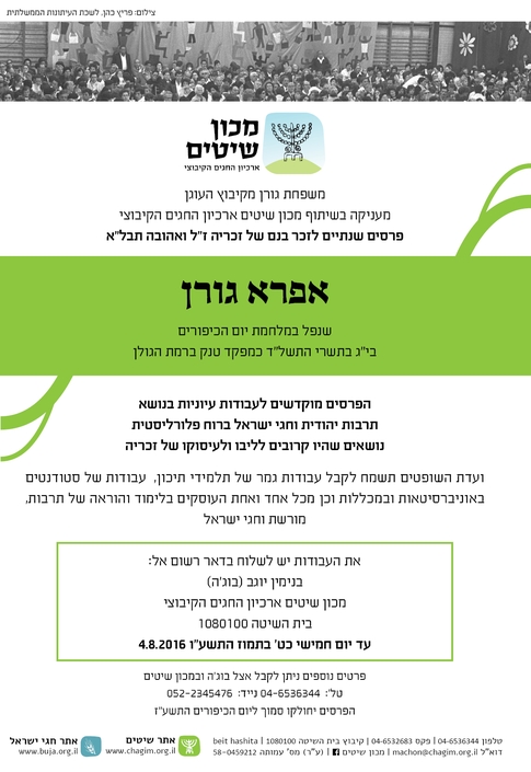 מכון שיטים בשיתוף עם משפחת גורן מעניקפרסים שנתייםלעבודות עיוניות בנושא תרבות יהודית וחגי ישראל ברוח פלורליסטית. אנחנו מזמינים תלמידי תיכון, סטודנטים באוניברסיטאות ומכללות ומורים/מדריכים/מחנכים העוסקים בלימוד והוראה של תרבות, מורשת וחגי ישראל להגיש עבודות. פרטים נוספים בלינק.
