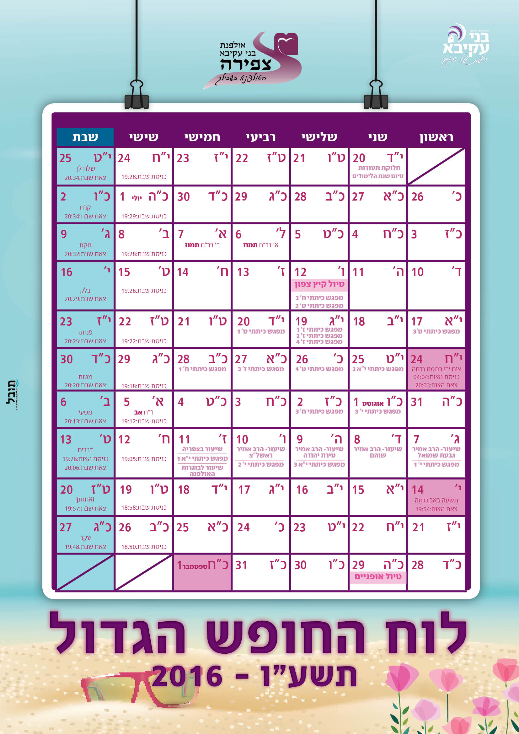שנת הלימודים תיפתח אי"ה, ביום רביעי כ"ז מנחם-אב (31.8.16). פרטים נוספים בהמשך בעז"ה.