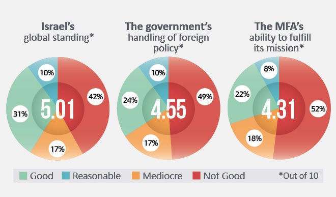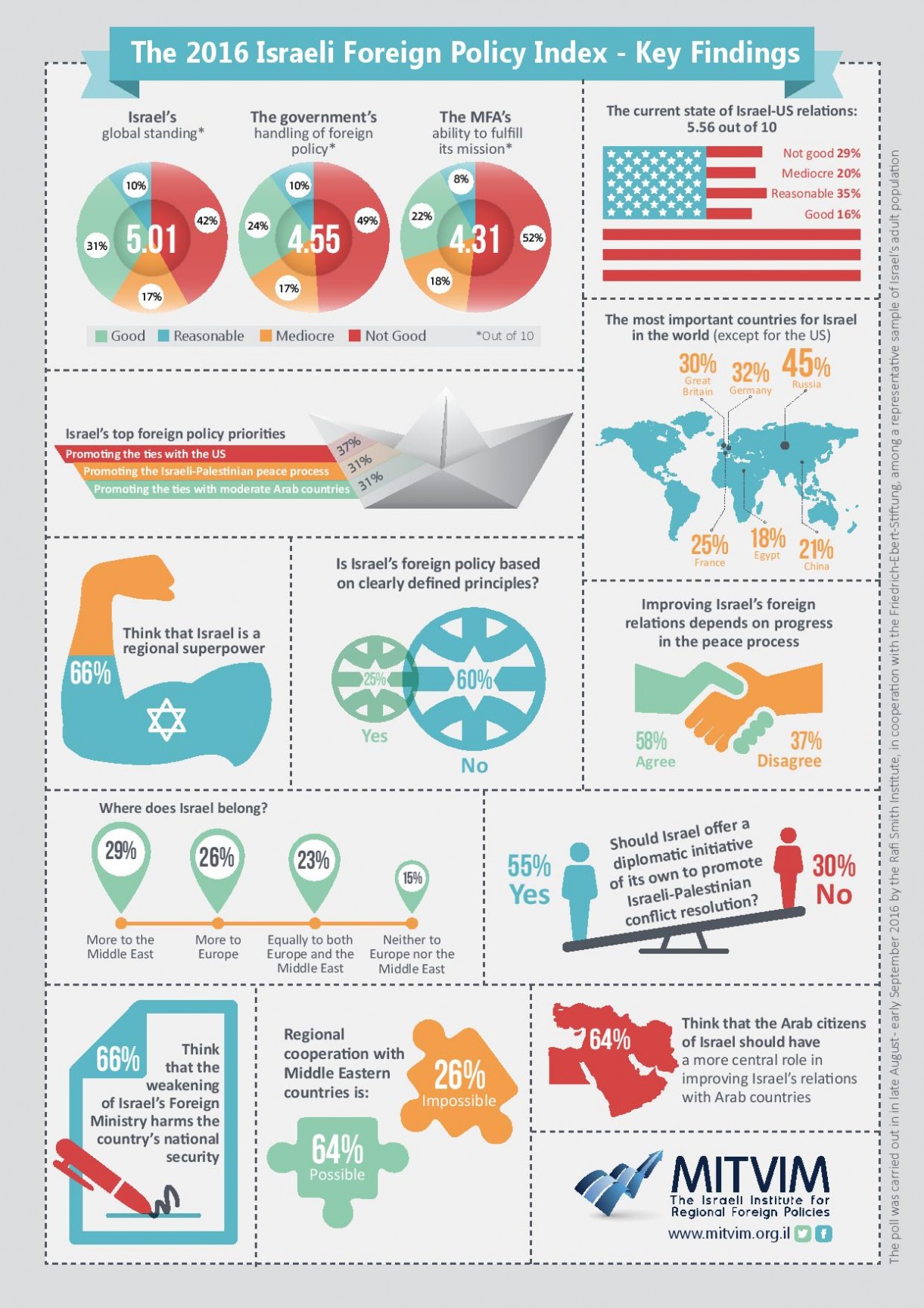 The 2016 Israeli Foreign Policy Index of the Mitvim Institute *** Mitvim mourns the loss of former President Shimon Peres - a champion of peace, regional cooperation, and diplomacy; an exceptional visionary, optimist, leader, and statesman *** The annual public opinion of the Mitvim Institute on Israel’s foreign policy was conducted, for the fourth consecutive year in late August - early September 2016. It was carried out by the Rafi Smith Institute, and in cooperation with Friedrich-Ebert-Stiftung, among a representative sample of Israel’s adult population. The poll included questions dealing with: Israel among the nations, the state of Israel’s foreign policy, foreign policy priorities and bi-lateral relations, regional belonging and cooperation, and the Israeli-Palestinian peace process. Key Findings 1. The Israeli public believes Israel's global standing is mediocre (average: 5.01 out of 10). Only 10% describe it as good. 2. The Israeli public does not agree with the popular claim that “the entire world is against us [Israel]” (51% vs. 39%). 3. A large majority of Israelis think that their country is a regional superpower (66% vs. 20%). 4. The Israeli public is dissatisfied with the government’s handling of foreign policy (4.55 out of 10). Only 10% describe it as good. 5. Two-thirds of Israelis believe that the lack of a full-time foreign minister and the weakening of the Ministry of Foreign Affairs’ (MFA) powers harm Israel's national security (66% vs. 19%). 6. The Israeli public is dissatisfied with the MFA’s ability to fulfill its mission (4.31 out of 10). 7. A large majority of Israelis think that Israel does not conduct its foreign policy with a clearly defined set of principles (60% vs. 25%). 8. Israelis think that their country’s foreign policy should prioritize the strengthening of ties with the US, followed by advancing the Israeli-Palestinian peace process, and improving ties with moderate Arab states. 9. Israelis believe that relations with the US at present are mediocre (5.56 out of 10). Only 16% think relations are good. 10. According to the Israeli public, the country with highest importance to Israel, besides the US, is Russia, followed by Germany, and then Great Britain, France, China, and Egypt. 11. A large majority thinks that regional cooperation between Israel and other Middle Eastern countries is possible (66% vs. 24%). 12. A large majority of Israelis want Israel’s Arab citizens to play a more central role in improving Israel's relations with Arab states (64% vs. 24%). 13. A large majority of Israelis see benefit in the recent reconciliation agreement with Turkey, especially in the area of security cooperation (26%) and the possible export of Israeli natural gas to Turkey (22%). 14. A majority of Israelis think that improving Israel’s foreign relations depends on making progress on the peace process (58% vs. 37%). 15. A majority of Israelis think that in the coming months Israel should offer its owndiplomatic initiative to promote the Israeli-Palestinian peace process (55% vs. 30%). 16. The Israeli public sees the option of a package including normalized relations with the Arab world, US security guarantees, and an upgrade of ties with the EU as the most effective incentive to increase support for the peace process.