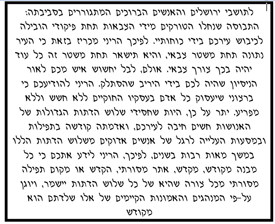 הבריטים דאגו להדפיס את הדברים שאלנבי התכוון לומר להמונים והם הופצו ב7 שפות שונות דקות ספורות לפני שהתחיל לנאום, והנה כאן נוסח ההכרזה הרשמית של סר אדמונד אלנבי על משטר צבאי, לאחר כיבוש ירושלים: