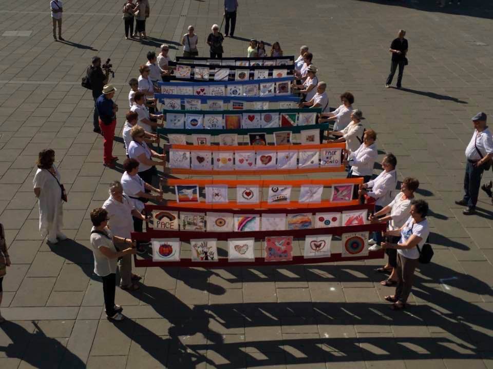 שטיח השלום גדל מיום ליום הודות למאות נשים, נערות ותלמידי בתי ספר בארץ ובחו"ל. עד כה נאספו למעלה מ-!3000 ריבועים והם ממשיכים להגיע מכל קצוות העולם. סדנאות להכנת פיסות שלום הפכו למרכיב מבוקש בארועים רבים. קראו אתהמכתב המרגששקיבלה עליזה ארז, רכזת הפרויקט, מקבוצת נשים מבוגרות בעיר פארטו באיטליה. הן הציגו את פיסות השלום שהכינו בטקס בהשתתפות ראש העיר לפני ששיגרו אותן אלינו. עתה, עם הגידול המבורך בהיקף הפרויקט, יש צורך בסיוע לוגיסטי ובמימון לתפירת השטיחים. קראו את פנייתה של עליזה.