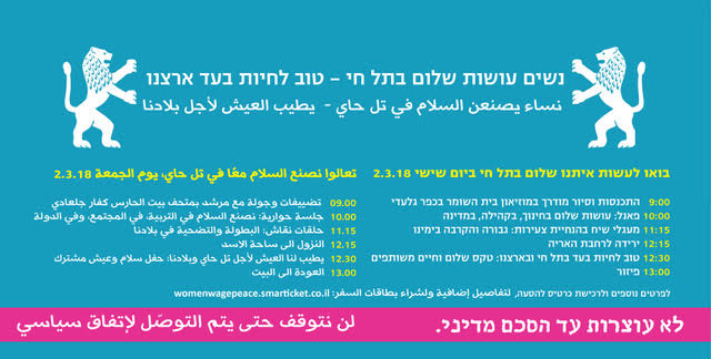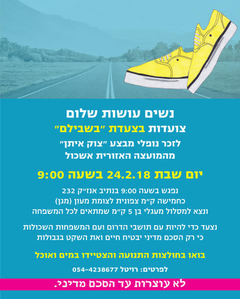 يوم السبت 24/2/2018 ستنظم في منطقة أشكول مسيرة لذكرى مواطني منطقة المجلس الاقليمي أشكول الذين سقطوا في عملية الجرف الصامد (تسوك إيتان). نحن نساء يصنعن السلام سنشارك في مسيرة أشكول كي نكون مع العائلات التي فقدت أحبائها، مع أصدقاء الذين سقطوا ومع كل هؤلاء الذين لم ينسوا الثمن الباهظ للحملة. سوف نسير لأن عملنا ولد من الألم الذي يعاني منه سكان أشكول، الجنود وعائلاتهم. سوف نسير كي نقول أن الإتفاق السياسي وحده سيتيح العيش بأمان وهدوء لسكان هذه المنطقة الخلابة ولمواطني الدولة جميعا. يفضل التسجيل مسبقا: http://osotshalom.ravpage.co.il/Bishvilam