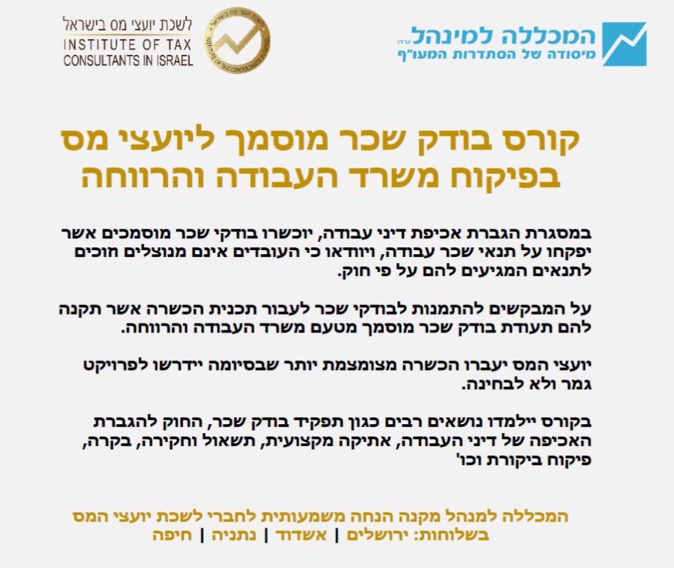 להלן הצעה מיוחדת לחברי הלשכה בלבד עבור לימודי קורס בודק שכר במכללה למנהל בשלוחות: ירושלים, אשדוד, נתניה וחיפה.