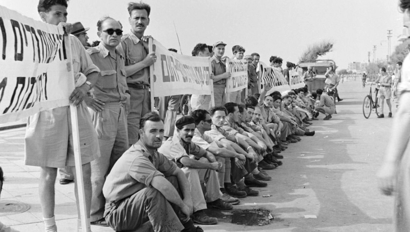 תמונה זאת מהשבוע לפני 70 שנים צולמה בסמוך לחוף הים בתל אביב, שם התכנסו מפגינים מול בנין קולנוע "קסם", (כיום: "בניין האופרה"), ששימש ב1948 כמשכנה של כנסת ישראל. שימו לב לבגדי החאקי הזהים לכל המצולמים, האם הם חיילים? מדוע ועל מה הפגינו? האם אתם מזהים מישהו מהם? נשמח אם תשתפו אותנו במידע שבידכם, על ידי משלוח פרטים לדוא"ל editor@nostal.co.il