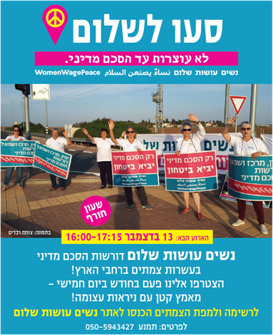 ביום חמישי 13.12 בין השעות 16:00-17:15 שוב נפשוט על הצמתים ברחבי הארץ ונדרוש כולנו יחד בו זמנית: התקדמו להסדר מדיני! יש חלופות מדיניות! לא מחכות לסבב הבא! וננסה לצרף אלינו ציבורים חדשים מישובים השוכנים על צירי תנועה.