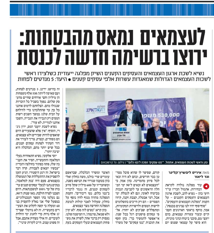 אנחנו חייבים להשכיל לשתף פעולה בהיקפים גדולים לרווחת כלכלת ישראל מכיוון שככל שיהיו יותר עסקים קטנים יציבים ומצליחים בישראל, כך תהיה כלכלת ישראל יציבה יותר ותחרותית יותר, דבר שבהכרח יסייע להורדת יוקר המחייה בפרט ולהגדלת הצמיחה והפריון ככלל, לטובת כלל אזרחי ישראל, לרבות המגזר השכיר.
