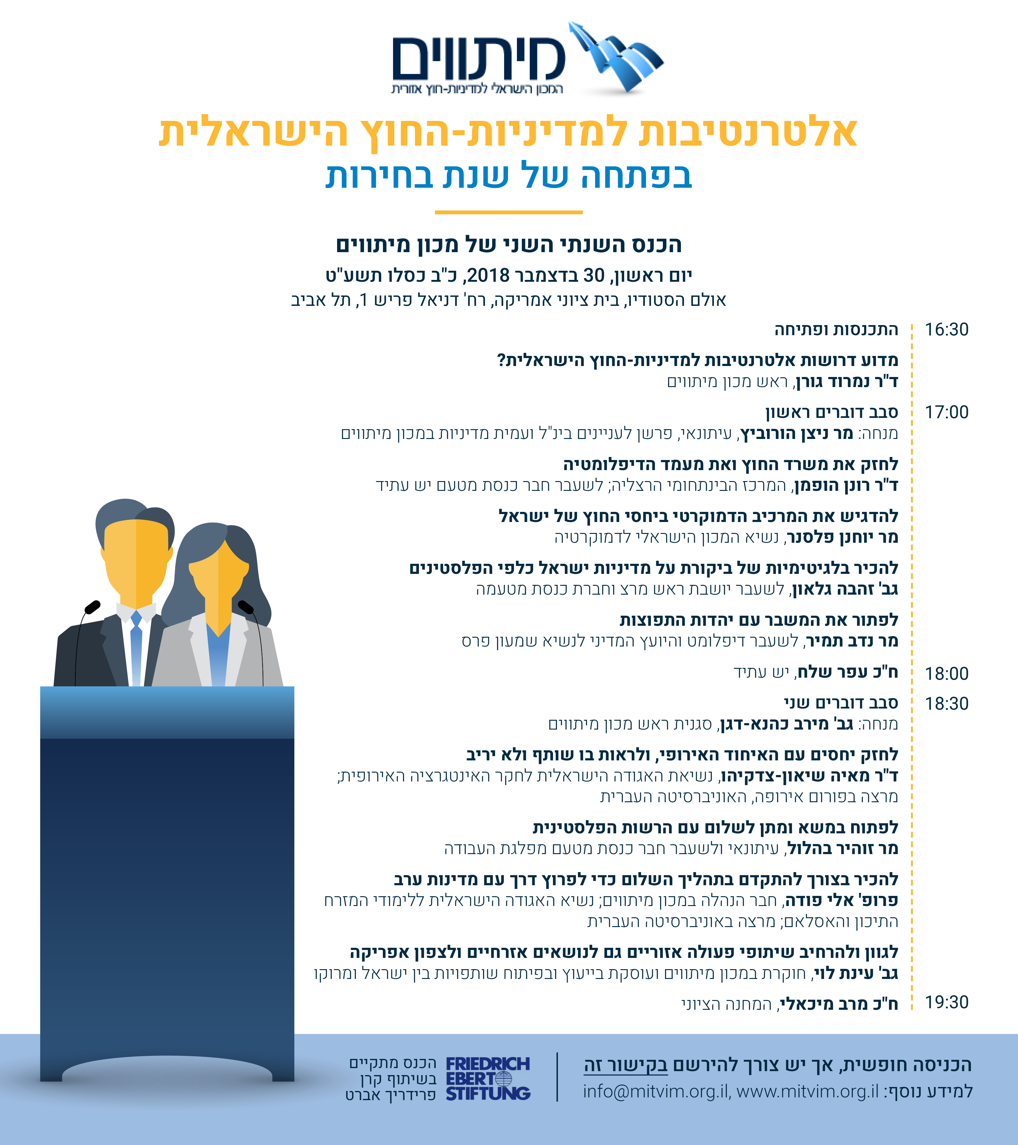 אלטרנטיבות למדיניות-החוץ הישראלית בפתחה של שנת בחירות סיכום הכנס השנתי השני של מכון מיתווים ב-30 בדצמבר 2018 נערך בתל אביב הכנס השנתי השני של מכון מיתווים בנושא "אלטרנטיבות למדיניות-החוץ הישראלית בפתחה של שנת בחירות". בכנס הציגו מומחים ואנשי ציבור כיוונים והמלצות לחיזוק מערך החוץ הישראלי, להעמקת ושיפור היחסים של ישראל במזרח התיכון ואירופה, ולקידום שלום ישראלי-פלסטיני. הדוברים בכנס היו חברי הכנסת עפר שלח ומרב מיכאלי, ד"ר רונן הופמן, יוחנן פלסנר, זהבה גלאון, נדב תמיר, ד"ר נמרוד גורן, זוהיר בהלול, ד"ר מאיה שיאון-צדקיהו, פרופ' אלי פודה ועינת לוי. את הכנס הנחו ניצן הורוביץ ומירב כהנא-דגן, והוא התקיים בשיתוף קרן פרידריך אברט. אנו מתכבדים לשתף אותך בתוצרים המרכזיים של הכנס: מסמך הסיכום (לאנגלית, לחץ/י כאן) אלבום התמונות (צילום: קונסטנטין גרוסמן)