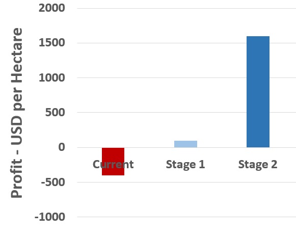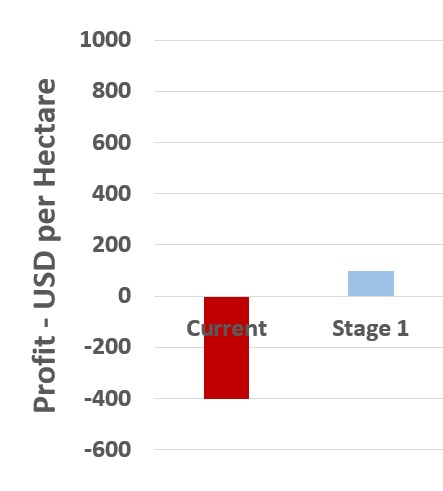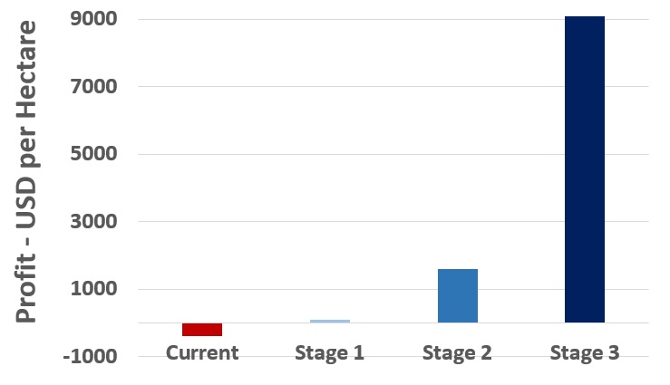 In 3 quick (1-3 years!!) and simple Value Creation Stages, we increased the Value per Hectare for the farmer from -400$ to 9,100$!