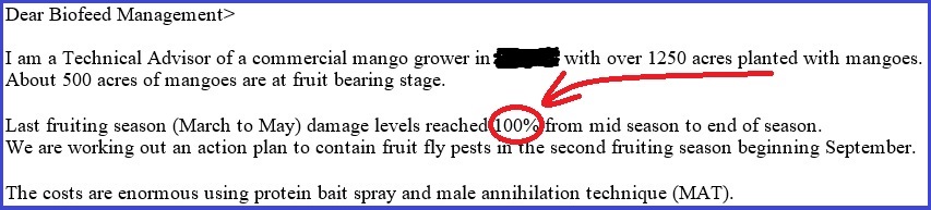 This is the place to note that Biofeed FreeDomedelivers a 21st Century perfect solution to the fruit fly problem, as it is; very highly effective (near zero% of infestation) and chemical-free.