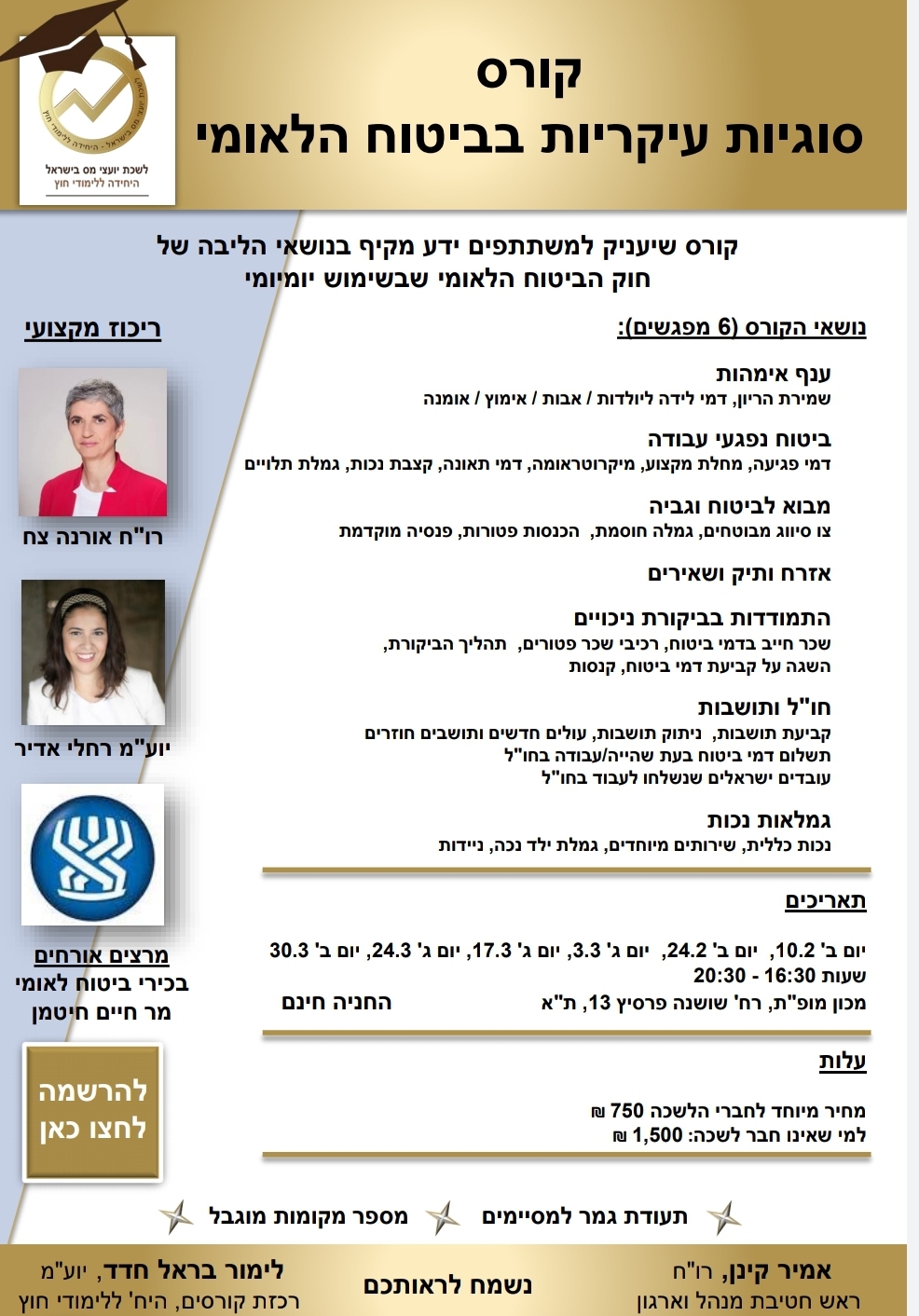 | יועצות ויועצי מס נכבדים, הרישום לקורס לימודי תעודה ייחודי בנושא סוגיות עיקריות בביטוח הלאומי בעיצומו! קורס יסודי, מעמיק ופרקטי אשר דן בסוגיות הליבה של חוק הביטוח הלאומי שבשימוש יומיומי . הקורס נבנה ע"י רו"ח אורנה צח, חברת נשיאות לשכת רו"ח ויו"ר ועדת הקשר הארצית של לשכת רו"ח עם הביטוח הלאומי ויוע"מ רחלי אדיר ממונת תחום ב"ל בלשכה. לצפייה בסילבוס הקורס לחצ/י כאן תעודת גמר תוענק למסיימים מספר המקומות מוגבל, מהרו להירשם! |