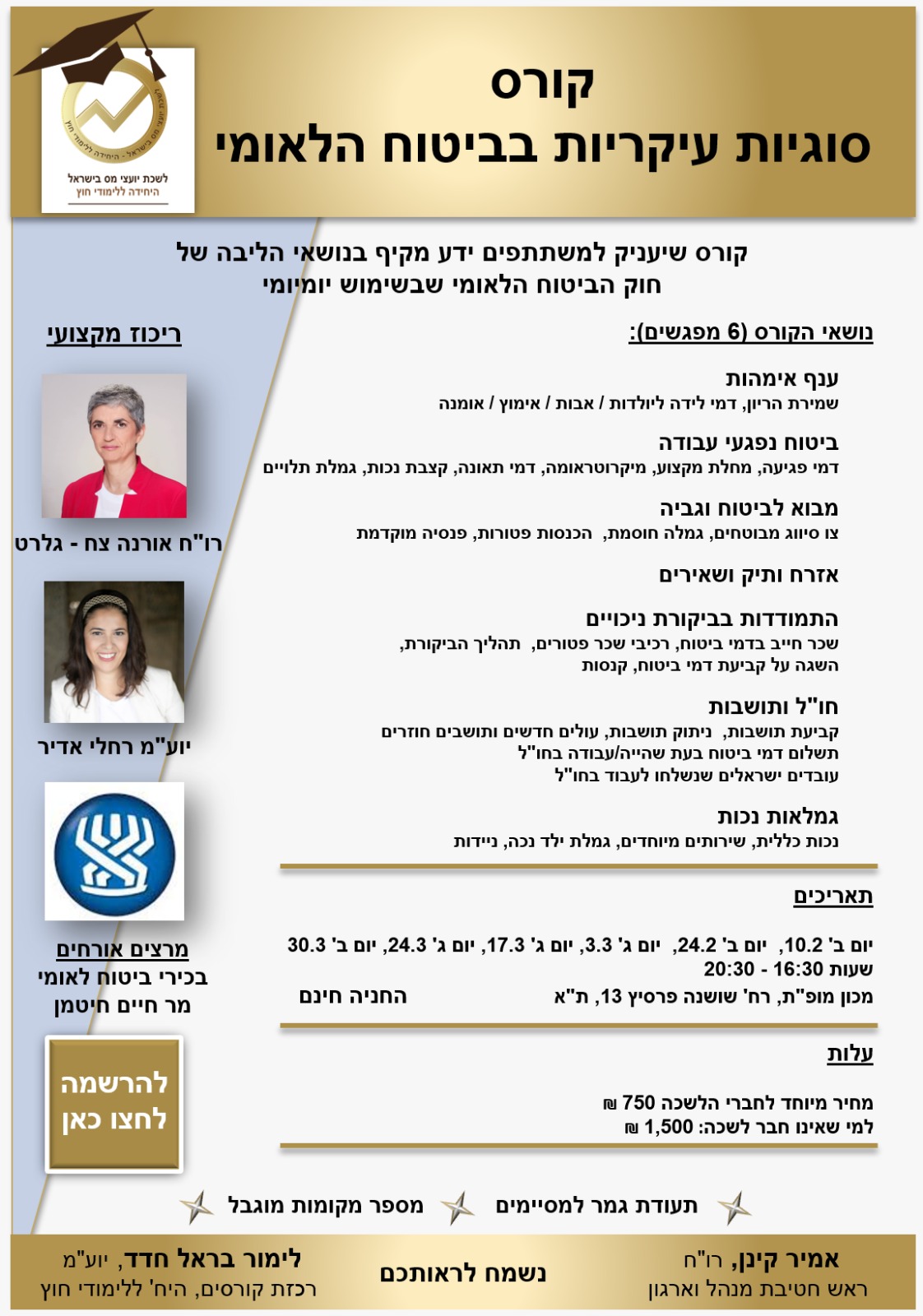| יועצות ויועצי מס נכבדים, טרם נרשמתם לקורס ביטוח לאומי של היחידה ללימודי חוץ? איך פועלים מראש למניעת חיוב בביקורת ניכויים? איך מתמודדים עם ביקורת ניכויים וממצאים? כל המידע מטובי המומחים. לא לפספס !!! מצב לינק לרישום: https://secure.cardcom.solutions/e/xzeY לצפייה בסילבוס הקורס לחצ/י כאן תעודת גמר תוענק למסיימים מספר המקומות מוגבל, מהרו להירשם! |