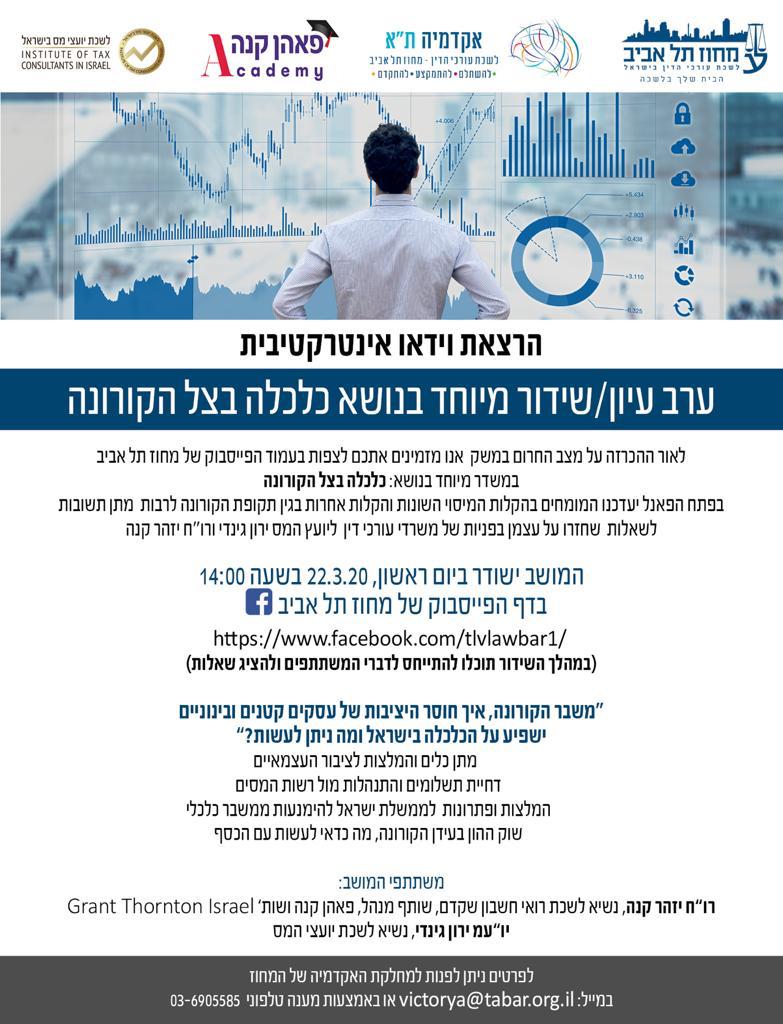 | חברות וחברים יקרים, היום 22.3.20 בשעה 14:00 יוע"מ ירון גינדי, נשיא לשכת יועצי המס ורו"ח יזהר קנה, נשיא לשכת רו"ח שקדם, מנהל שותף בפאהן קנה ושות' Grant Thornton israel יעבירו ערב עיון/שידור מיוחד בבית הפרקליט, לשכת עורכי הדין מחוז תל אביב בנושא: "משבר הקורונה, איך חוסר היציבות של עסקים קטנים ובינוניים ישפיע על הכלכלה בישראל, ומה ניתן לעשות?" מצורף קישור לשידור>> https://m.facebook.com/tlvlawbar1/ |
