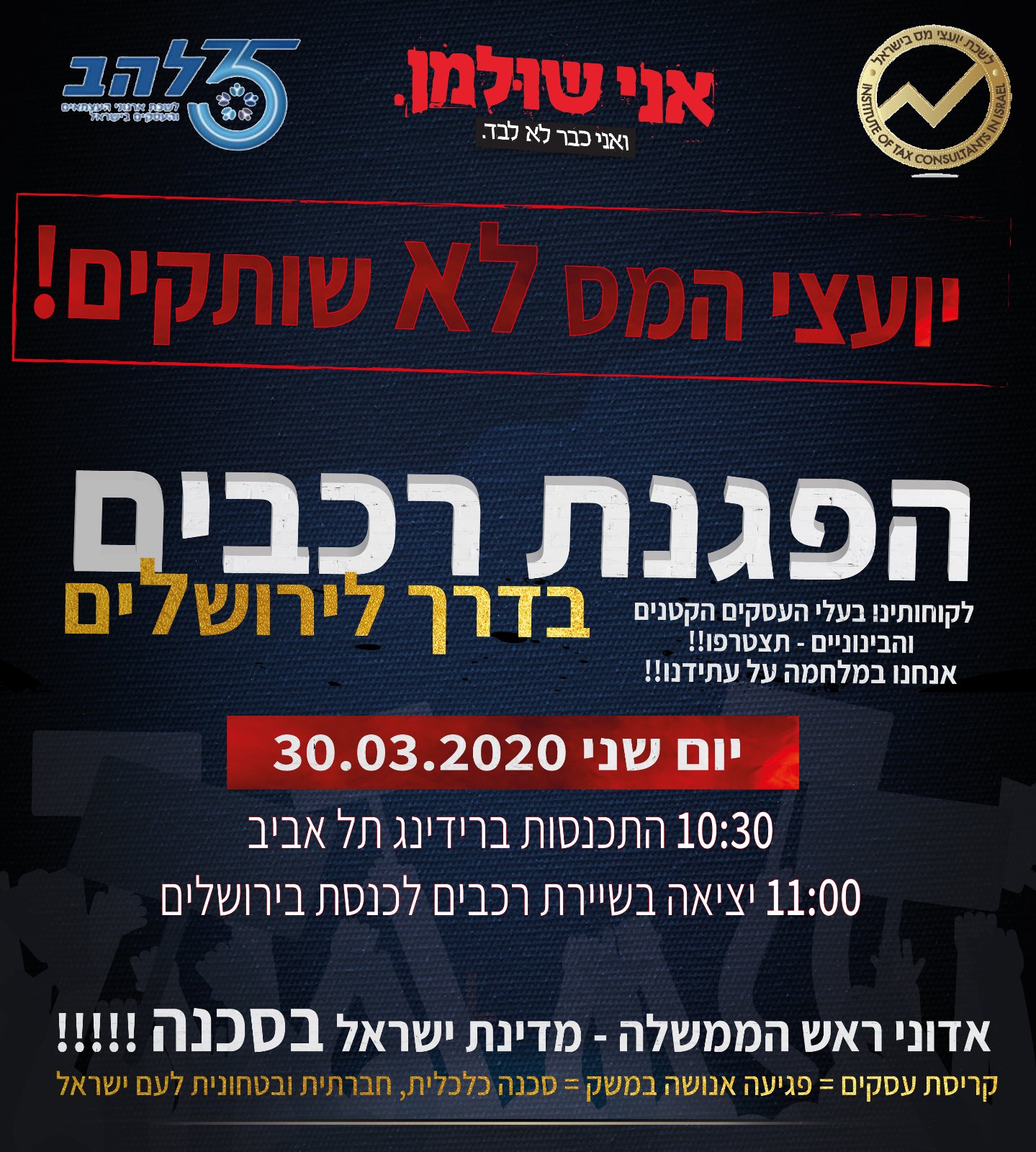 ביום שני הקרוב (30.3) נעלה לירושלים בשיירת רכבים, כדי להבהיר לראש הממשלה בנימין נתניהו, שהפתרון, המוצע כעת למגזר העסקי, לא יאפשר למדינת ישראל לעשות את הדבר היחיד, שיציל את הכלכלה שלנו, וזה החזרת המשק לפעילות מיד בסיום המשבר הבריאותי, מכיוון שהפתרון המתגבש לא מונע את קריסת העסקים הקטנים והבינוניים, וכשהם שבורים ונטולי יכולת ביצוע וייצור, לא יהיה כאן מי שיחזיר את המשק לפעילות.