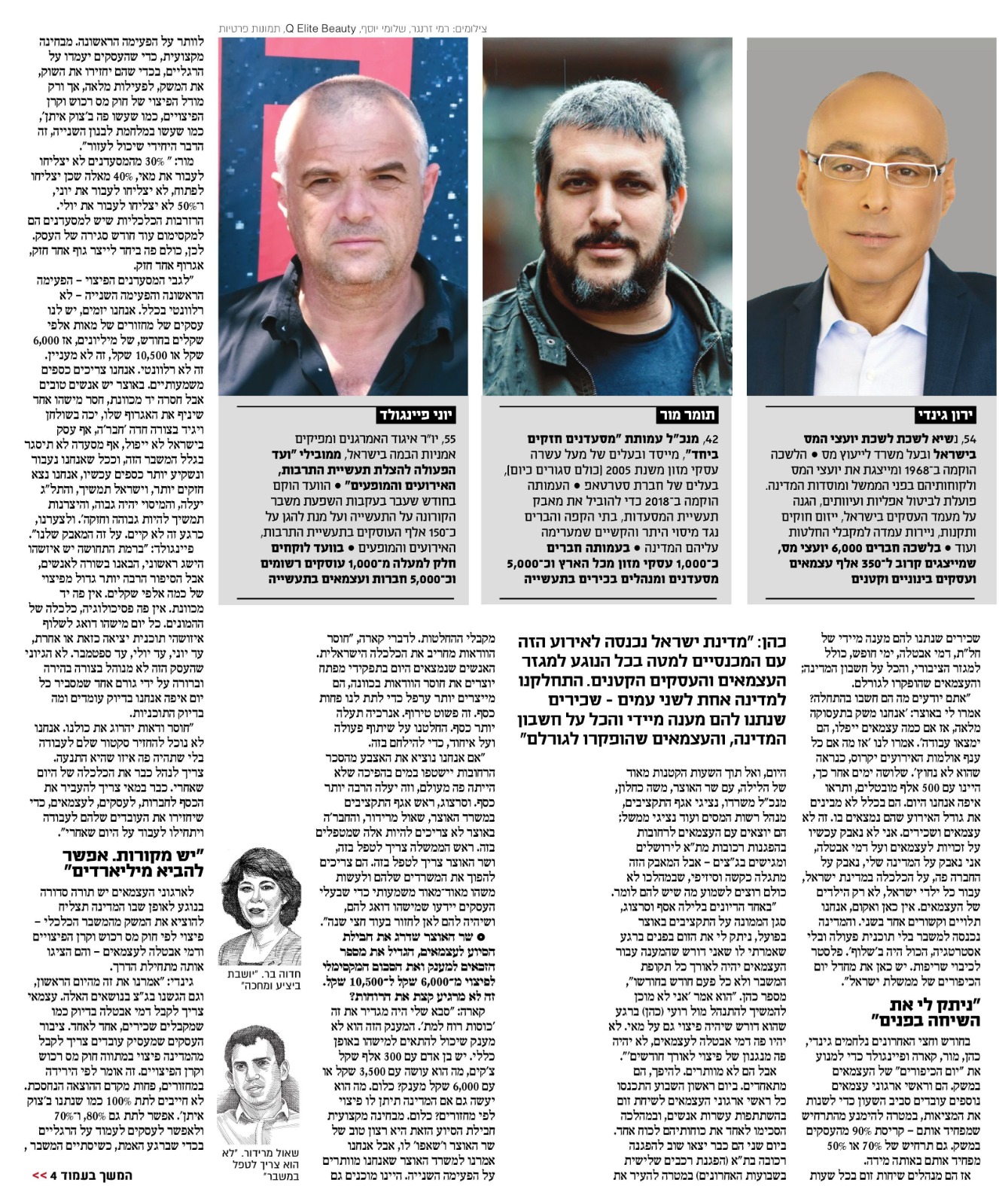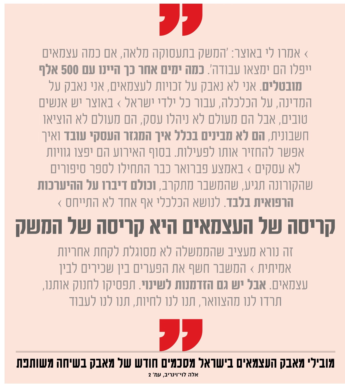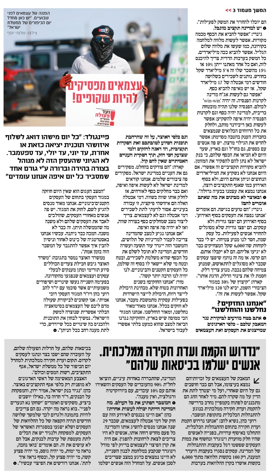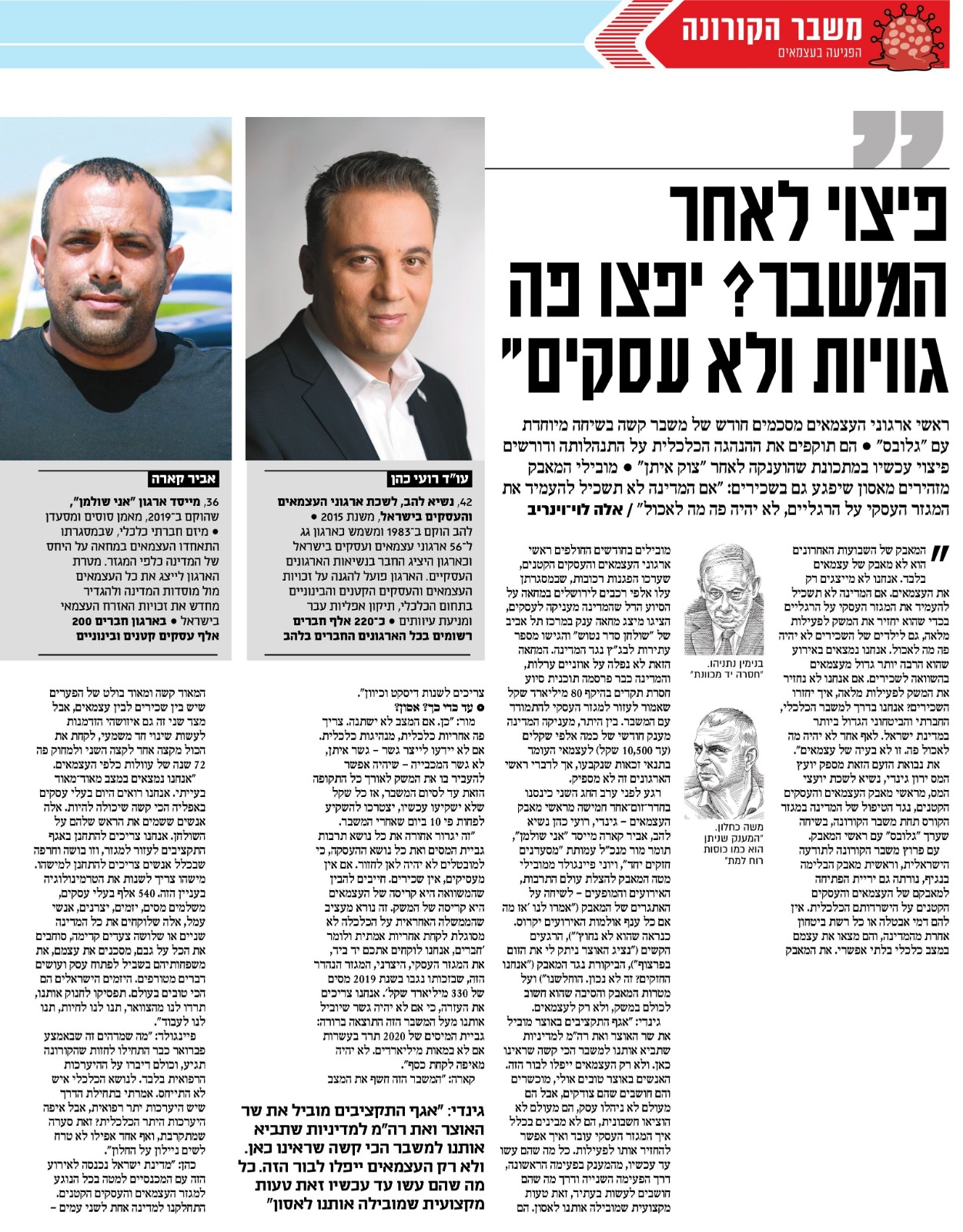 בעיתון המודפס וגם באתר, התפרסם ראיון משותף של ראשי הארגונים, שעומדים בחזית המאבק המקצועי והציבורי להצלת כלכלת ישראל. גם הכתבה נפתחת בדבריו של ירון : "המאבק של השבועות האחרונים הוא לא מאבק של עצמאים בלבד. אנחנו לא מייצגים רק את העצמאים. אם המדינה לא תשכיל להעמיד את המגזר העסקי על הרגליים בכדי שהוא יחזיר את המשק לפעילות מלאה, גם לילדים של השכירים - שהם ההורים שלנו, אחינו, הנשים והבעלים שלנו - לא יהיה פה מה לאכול. אנחנו נמצאים באירוע שהוא הרבה יותר גדול מעצמאים בהשוואה לשכירים. אם אנחנו לא נחזיר את המשק לפעילות מלאה, איך יחזרו השכירים? אנחנו בדרך למשבר הכלכלי, החברתי והביטחוני הגדול ביותר במדינת ישראל. לאף אחד לא יהיה מה לאכול פה. זו לא בעיה של עצמאים".