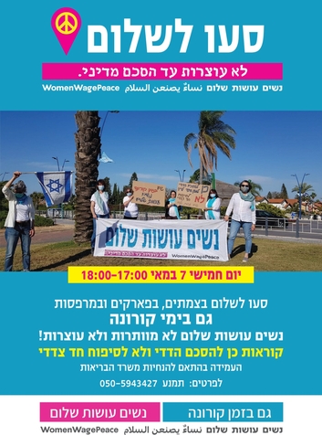 | האתגרים שיצרה הקורונה לא פסחו על נשים עושות שלום. כתנועת שטח שעיקר פעילותה במרחבים הציבוריים, נאלצנו להעביר בבת אחת את הפעילות לערוצים הדיגיטליים. אבל אנחנו לא עוצרות עד הסכם מדיני, וגם הקורונה לא תעצור אותנו!