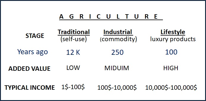 | SITUATION IN EMERGING ECONOMIES In emerging economies, a large proportion of farmers are still in the phase of Traditional Agriculture, which ultimately doesn’t enable them to economically develop and change their living standards. As presented above, Traditional Agriculture has very different characteristics and outcomes from those of Industrial Agriculture or those of Lifestyle Agriculture. Therefore, if we want to advance the economy of emerging countries then we need to focus on nurturing the Agri-industry and Lifestyle Agriculture types. Some think that supporting by subsidizing the Traditional Farmers, i.e. giving money to farmers, will help to improve the agri-sector and turn into a self-sufficient, growing, and vibrant sector contributing to grow the country’s economy and achieve its goals. But that never happened before in big scales, and there is a small chance it will ever happen in the future. By subsidizing, in the best scenario, those farmers will become less poor, but they will continue to request (more and more) of the state support. Under a more realistic scenario, the opposite will happen and farmers will become poorer. Subsidize will sentence these farmers to many more years of poverty. Farmers will increase their income and will join the middle-class ONLY when they will begin to practice the more advanced types of Agriculture. The subsidized budget can, therefore, be used in a different way to transfer the agri-sector into a far more advanced type of Agriculture. That will result in rapid income increase of hundreds of percent, and a decreased need for state support. A win-win situation. For this to take place, a country needs to lay the proper foundations to enable the Agri-industry revolution. To do so a country needs first to have a BRAVE LEADER. THE ECONOMIC LEAPFROG The structured transition from Traditional Agriculture to a more advanced type of agriculture will lead to long term, unprecedented, economic, and demographic changes. China and its past 40 years history, is such an example; it changed its economy from Traditional to Industrial and with it much of its Agri-sector, which is now much more effectively supporting the life of 1.4B people and even became a strong food exporter. Such a change does not happen by itself. Strong and courageous leadership is needed to lead such a process. A fearless leader having a long-term vision is what agrarian countries should hope and look for. SUMMARY To change the agri-sector in emerging economies one needs to: a) Understand the long-term history and economic revolutions and evolution process. b) Have a deep understanding of the current situation in the target country (wishing to change). c) Have a local leader having their genuine dreams of the future of their country with a clear vision, goals, and targets. d) Have a plan of how to carry on the change to reach his goals, and targets within a defined time frame. e) Professional support to integrate the relevant factors, as described above, and design a proper work plan according to a well-defined model.