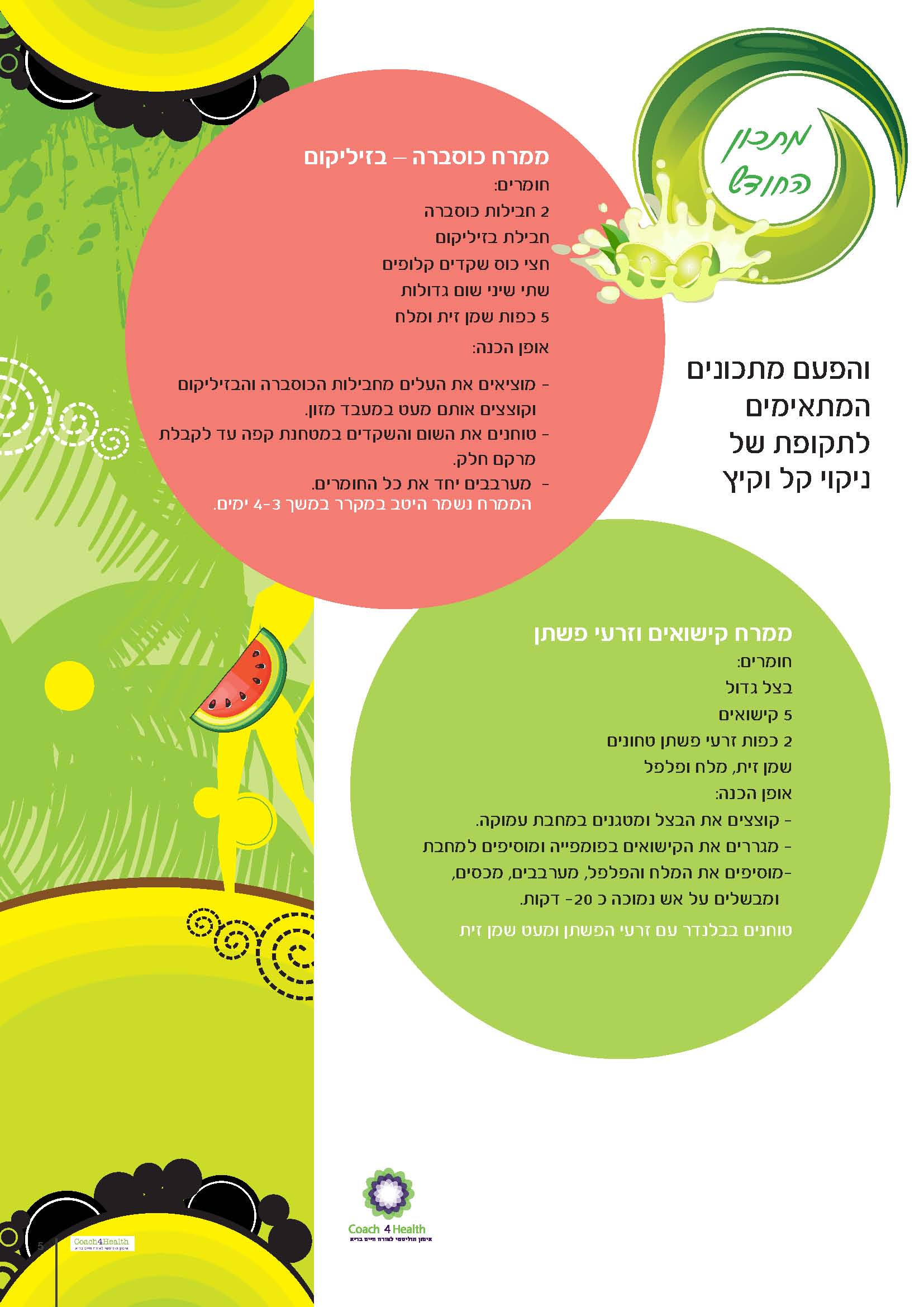 | | כלים מעשיים לשמירת הבריאות | | | | אני לוסי רבין – בעלת Coach4Health מחויבת מאוד לקהילה, משקיעה בה הרבה מעבר למאה אחוזים, ורוב הזמן אני נמצאת בשטח כדי לקדם כמה שיותר את חזון הבריאות. האתגר העיקרי שלי הינו לתקשר עם חברי הקהילה של Coach4Health, ולשלוח עדכונים וטיפים מעשיים, להיות נוכחת לצרכים של הקהילה ולהביא תשובות מעולם הרפואה אינטגרטיבית ומשלימה. כשאנחנו מדברים על תקשורת מבוססת מערכות יחסים, מטרתנו כבעלי עסק היא להכיר את לקוחותינו כמה שיותר טוב, כדי שנוכל לייצר תכנים, מוצרים ושירותים שיתאימו להם במדויק. מטרתי היא לתת לכם, אני קוראי הנאמנים, תוכן ממוקד ורב גוני בעל ערך מוסף, עצה טובה, או כלים שאינכם מכירים... ללא ספק הצבתי רף גבוה. אנחנו רוצים, מבקשים ומצפים שתשלחו לנו הערות, בקשות ורעיונות שנוכל לייצר לכם תוכן חי, אקטואלי ונכון. זוהי תקופה שיש בה ריבוי מסרים שאינם תמיד נכונים. בכל עת תוכלו להסיר את עצמכם מרשימת הדיוור שלנו על ידי לחיצה על כפתור הסרה מהרשימה בתחתית העמוד. | | | | | בשנים האחרונות הולכת וגוברת המודעות לחשיבות הטמונה בתזונה נכונה ובמזון בריאות. ובכל זאת אנשים רבים – רבים מדי – ממשיכים לקנות אוכל מעובד ולהתעלם מקיומם של מזונות החיוניים כל כך לגופם. בקרב אנשים רבים נוצר הרושם כי תזונה בריאה עולה כסף – והרבה. אך אין זה חייב להיות כך! אם מורידים מהתפריט את האוכל המעובד, את הממתקים והחטיפים העודפים ואת השתייה הממותקת – שאינם בריאים בעליל, ופשוט יקרים – מתפנה תקציב למצרכים הבסיסיים הנחוצים על מנת להכין ארוחות בריאוֹת, טעימות ומזינות. את רוב מצרכי הבסיס לארוחות אלה אפשר לקנות בזול. עצם הבישול הביתי חוסך הרבה כסף, וזאת – בפשטות, במהירות ובבריאות. יתרה מכך, ברגע שאתם "טורחים" בעצמכם ומכינים את המזון הבריא אתם נמצאים עמוק בתוך תהליך ההבנה באשר לרכיבים הנכונים לגופכם, המצרכים שבהם תמצאו אותם, והתפריטים המתאימים. הדבר תורם למודעות שלכם, וליכולתכם להתמיד ולנהל אורח חיים נכון ובריא – בעבורכם ובעבור יקריכם. אינכם חייבים לקנות את המצרכים המיוחדים והמפוארים ביותר... קנו ירקות ופירות בעונתם. הם טובים יותר, עסיסיים יותר, מכילים יותר רכיבים טובים – וזולים הרבה יותר; הצטיידו בדגנים ובקטניות. אלה הם מזונות בסיסיים המספקים לגופכם פחמימות וחלבונים. הם דלי שומן ועשירים בוויטמינים ובמינרלים. כמו כן הם זולים מאוד, ונשמרים לתקופות ארוכות; שלבו בתזונה שלכם דגים – המלאים בכל טוב לגופכם. ליקטתי ואספתי חומרים שאני מקווה יחדשו לכם את חיי היום יומי שלכם, של הילדים ושל המשפחה כולה. אני מקווה שתפיקו מהם עוד מידע וידע רב למען אורח חיים בריא. שלכם, לוסי רבין Coach4Health | | | כשעליתי לפני שנים מגוואטמלה, עשיתי זאת לבד. כבר כנערה ידעתי להיכן פני מועדות. זה לא שלא פחדתי, חששתי כשם שחושש כל נער מתבגר המחובר עדיין "בחבל טבורו" אל משפחתו האהובה, אבל החלטתי שבחיי לא אתן לפחד לשתק. היה זה צעד שהשליך על כל חיי. ברור לגמרי שאילולא הייתי עולה לבדי מטעמים אידיאולוגים אל ארץ ישראל, ודאי הייתי היום לא רק במקום פיזי אחר, הייתי גם מתמודדת עם שארית חיי באופן אחר. תקיעות – "פלונטר" שניתן להתיר התנסויות עבר לא פעם מובילות אותנו בדרכנו, לעיתים זה קורה כשהדבר כבר לא משרת אותנו עוד, במקרה כזה הוא יוצר "תקיעות". לעיתים "התקיעות" הזו נובעת מכאב אמיתי או פחד. התובנה הזו הכתה בי במהלך עבודתי ב"פלטכניקה" בה הייתי שותפה לפיתוח תחום חדש שנגע במוצרים רפואיים. זו היתה הפעם הראשונה בה פגשתי את הצורך של אנשים למנוע כאב, להקל על הסבל הכרוך בטיפולים רפואיים, זה מה שהנחה אותי בפיתוח המוצר, זה גם מה שהנחה אותי כמטפלת בתחום הנטורופתיה, תחום שהפך לכלי אינטגרלי בתוך תהליך האימון שלי. הובלת תהליך – הכל מתחיל בהקשבה ובאמפטיה פרט לתחום הטיפולי בו אני עוסקת עד היום וכן משלבת אותו באימון, היותי בוגרת מנהל עסקים המתמחה בשיווק דבר שתרם רבות לניסיוני העשיר בהובל