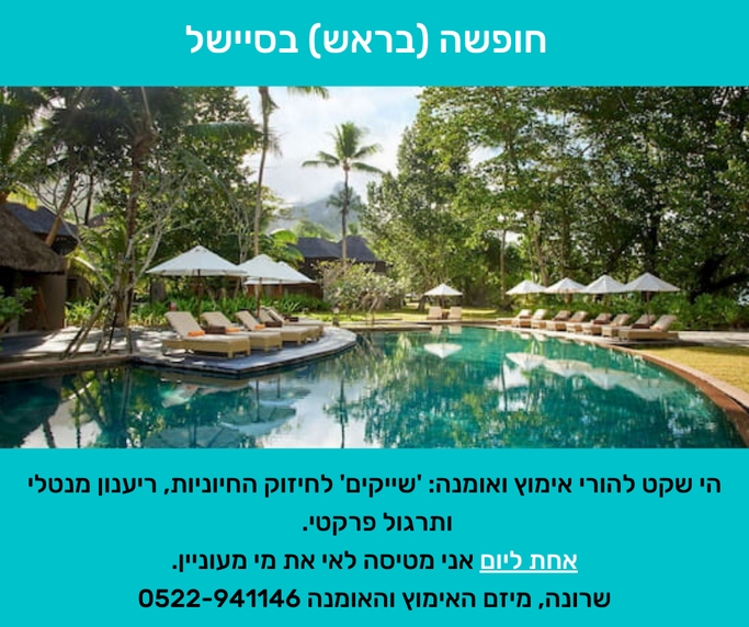 | הקבוצה מתנהלת באוירה של חופשה בסיישל. שותים אננסים ומכדררים קוקוסים: שיתוף והתייעצות של הורי אימוץ ואומנה. קבוצה מלאת ערך טרופי ועידכון על פעילויות צלילה ואכילה. הזדמנות להיות יוזמים ושותפים לעשייה. להצטרפות שילחו אלי הודעת ווטסאפ ל- 052-2941146 עם שם ושורת תיאור אודותיכם. |