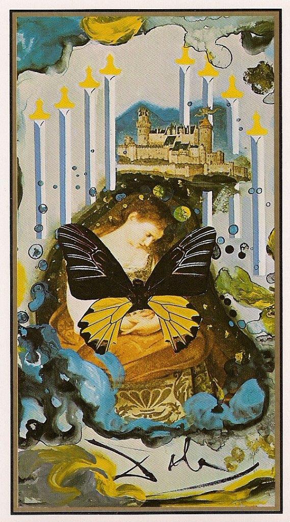 בקלף אנחנו רואים דמות מוקפת בחרבות, כבולה, מביטה מטה,