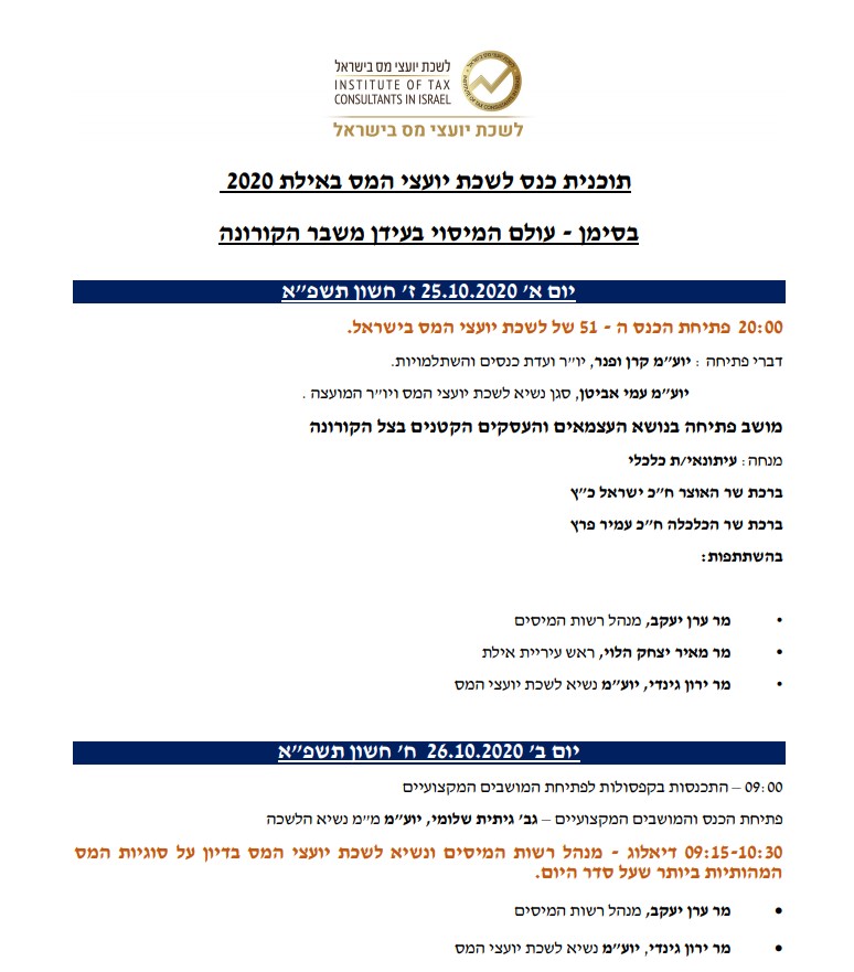 מצורפת התוכנית המקצועית של כנס אילת והפעם בסימן עולם המיסוי בעידן משבר הקורונה. למרות האתגרים החדשים העומדים בפנינו ועל אף הקשיים בתכנון וארגון כנס מקצועי כזה, חשוב היה לנו להעניק ליועצי המס כלים וידע מקצועי על מנת שנוכל לתת ללקוחותינו את השירות הטוב והמקצועי ביותר.