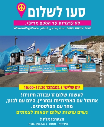 | לעשות שלום זו עבודה חיונית! ביום ג' 3 בנובמבר עוברות לשעון חורף , ומקדימות את היציאה לצמתים לשעה 16:00-17:30. מעתה נצא לצמתים בימי שלישי כדי להבליט את נוכחותנו ולא להתערב במחאות האחרות :)) נשוב ונזכיר שהסכמי השלום עם האמירויות ובחריין מבורכים וחשובים, אך השלום האיזורי המיוחל יגיע רק כשהפלסטינים יהיו חלק ממנו. רשימת הצמתים והרכזות | | |
