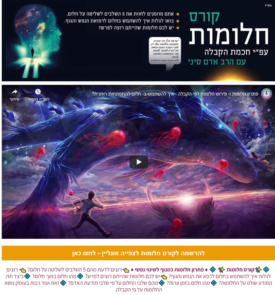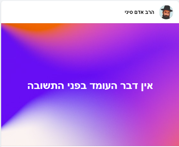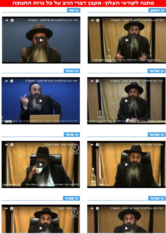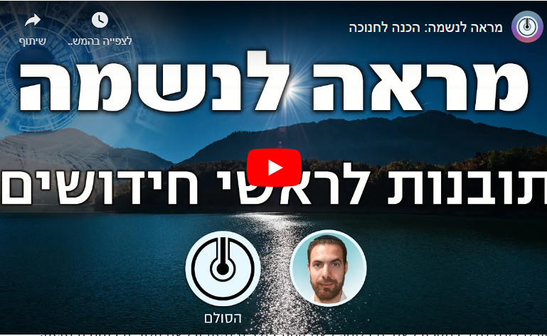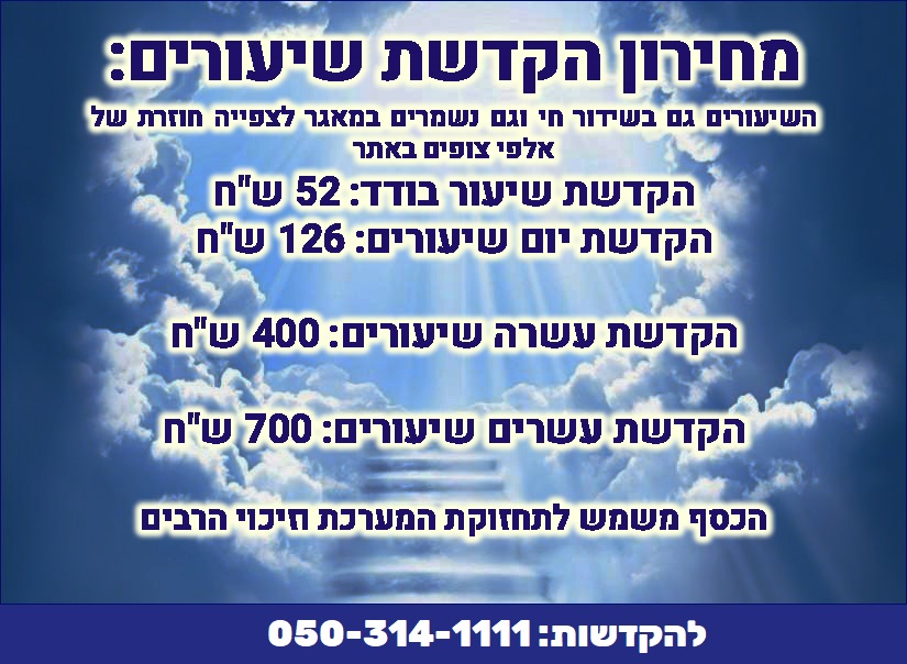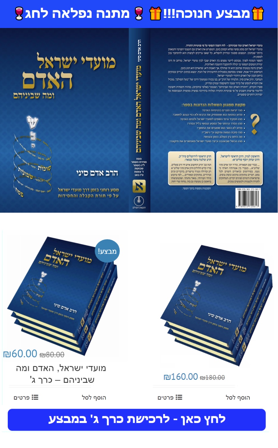 פנייה אישית יהודי יקר, בן מלך, אהוב ה'. כאשר אתה מתבונן על ילדך, לא פעם אתה אומר, למה אינו עושה מה שברור שטוב לו, מה שיגרום לו להיות יותר אדם?! ואני אומר לך, בן מלך אתה בכוח. חנך עצמך. הוצא מהכוח אל הפועל את היהודי שבך. מצא את פך השמן החתום בחותמו של כהן גדול שבנפשך, מצא את מידת ההשפעה של החסדים המכוסים והשמורים מכל החיצוניות והגופניות הצרה עליך. חבוי הוא בנפשך. עם נקודה פנימית זו. עם אמונה זכה זו, הדלק את נשמתך ותהיה בע"ה בן מלך, אהוב ה', מתענג במצוות ויורש עולם הבא. הרב אדם סיני מתוך ספרו של הרב "מועדי ישראל האדם ומה שביניהם"