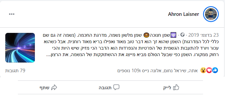 חייב כל יהודי להאמין בנס. להאמין שה' יהיה בעזרו וימצא הוא את הנקודה שבלב. את נקודת נשמתו, שממנה תואר כל הנשמה. הוא הסימן ש״שמן זך״ זה עולה בחשבון זי״ת, שנקודה פנימית זו היא מעל הטבע. יכולה היא להאיר שמונה ימים, יכולה היא להאיר את הנשמה שהיא אותיות שמֹנה. יכולה היא להתעלות מעל המספר שבע, שהוא סימן לעולם הזה.