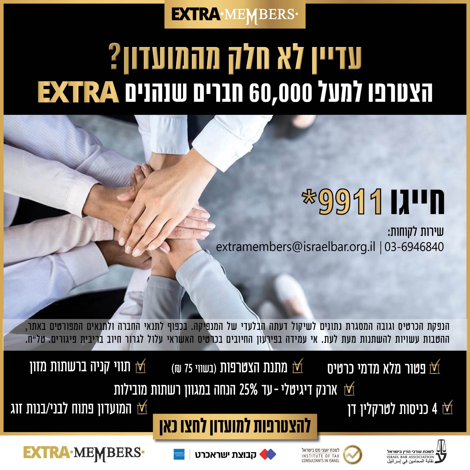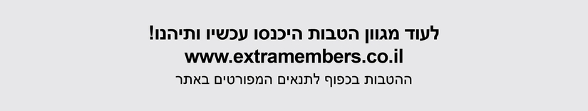 | חבר/ה יקר/ה, הודעה זו נשלחת באמצעות מערכת הדיוור המועדון, הכוללת מנגנון הסרה עצמית מרשימת התפוצה של ההודעות הנשלחות מטעם מועדון EXTRA MEMBERS. במידה ונתקלת בקושי בתהליך ביצוע ההסרה העצמית, או אם למרות פעולת ההסרה לא תוסר/י בפועל מהרשימה, נודה אם תודיעו לנו על כך באמצעות מייל לכתובת info@ymas.org.il |