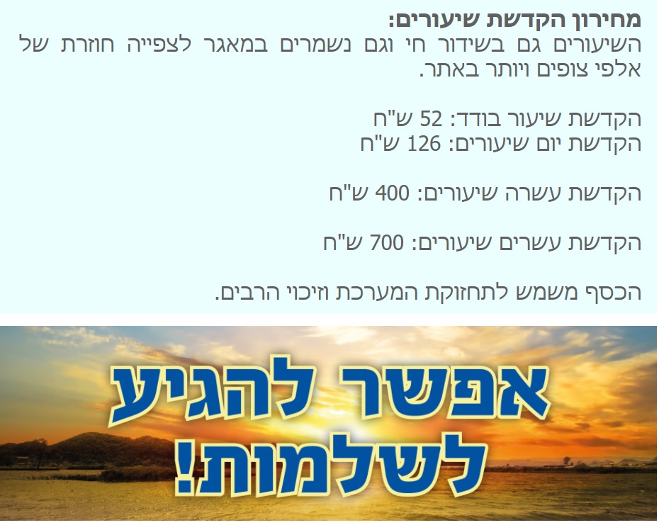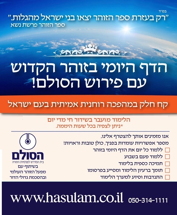 ניתן גם להקדיש את שיעורי הזוהר להצלחה, לעילוי נשמת, לרפואה וכו' לפרטים: 050-314-1111