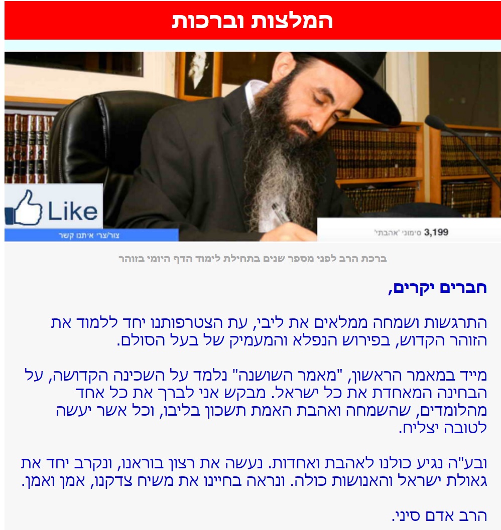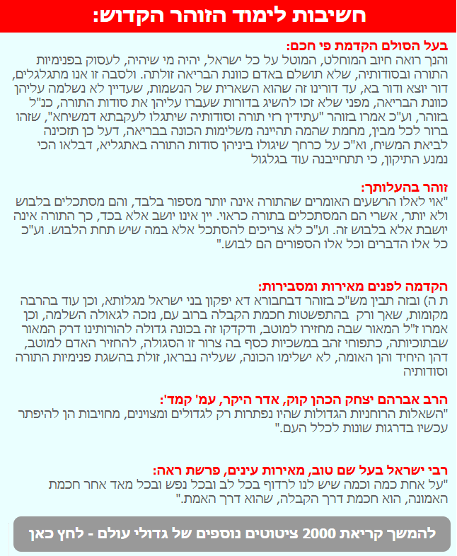 בנוסף אנו מצרפים לכם בהמשך את ברכת הרב מלפני מספר שנים כשהתחלנו את הסדר לימוד של הדף היומי בזוהר ועוד מאמרים סרטונים והפתעות על חשיבות הפנימיות, דפדפו למטה וגלו.