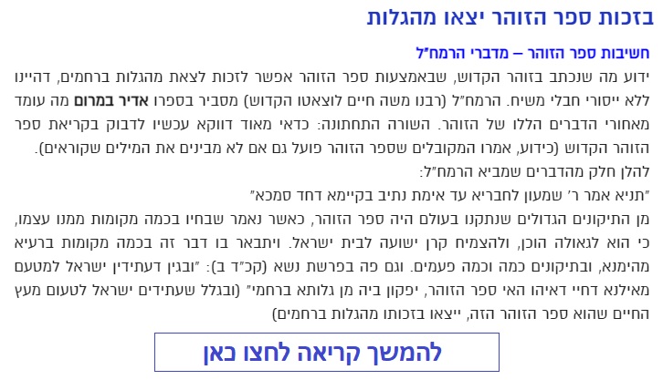 ובע"ה נעשה ונצליח, ויתקיים בנו מה שאמר רבי שמעון בר יוחאי: "בהאי חיבורא דילך דאיהו ספר הזוהר יפקון ביה מן גלותא ברחמי" |