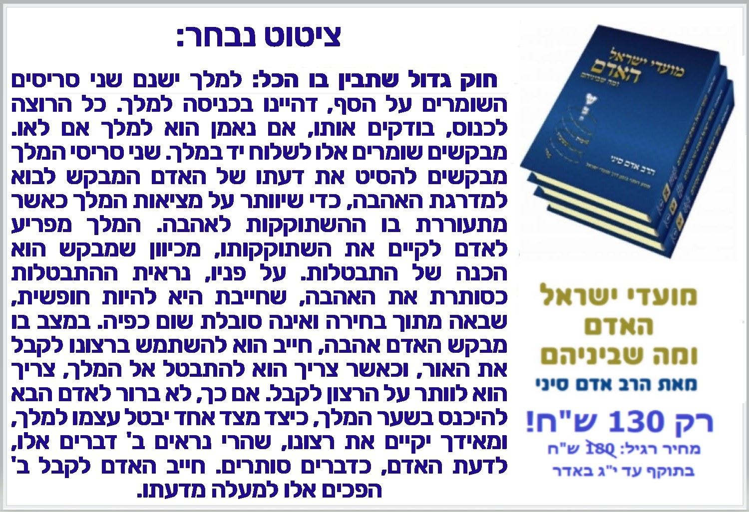 | לעיתים פוגש האדם בגדולתו את הקושי מלקמוץ את היד הפתוחה מרוב אהבה, ובעת הנתינה לשמור על מידת הבושה. עשבים שוטים מתבקשים להיקרא חיטה, ואת מרכולת לשונם מפזרים ברוח זרה. לעיתים בושה נפשי במתנות שחלקתי לכל עובר אורח. גם בשלכם אבן רחוק מעצמם, תשוב היא ותיפול אל קרבם. לעיתים לא יחושו בה, אך יחושו היטב בתוצאת פגיעתה. הנה מוחה של העלוקה ששתי בנות לה, הב הב, נהירה לנפשי מאוד ומתגברת במלוא עוזה. הגיע העת לזכור למחותה ולא לשכוח. אדיש אני ליהירותה הססגונית ואיני מתרשם יותר מהגנדרנות הטווסית שלה. צועד אני בתוך נפשי אל שבתי שבכוחה אמחה את מוחה בגאוות מנצחים. איני עלוב די כדי להצטער על מותה, ואף שמחה בה איני רוצה. עיוור אני לעיתים לרוח. אולם שמח אני בעוורוני ובוחר ללכת למעלה מדעתי. כי סומא אני למוחלט, אבל הוא אותי מוביל לגילוי ההסתר שבתוכי. מוכן אני לשבתי. הרב אדם סיני |