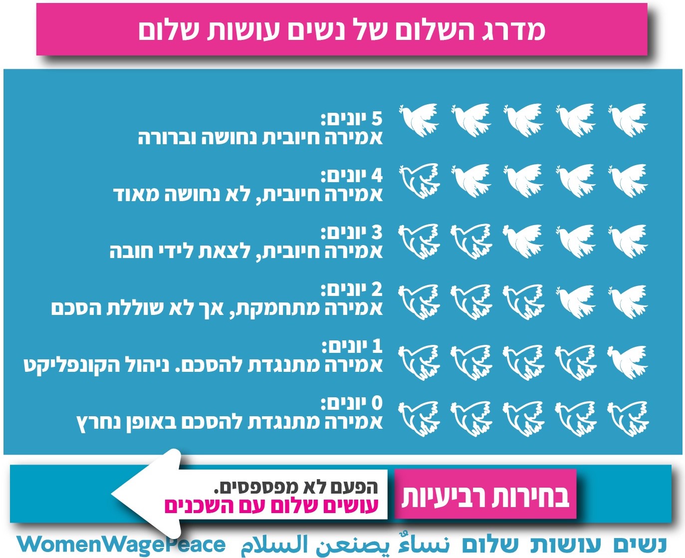 ומדרגות את דברי המועמדות/ים במדרג היונה/שלום. נשאלנו האם המדרג מסמן גם את המועמד/ת עצמו/ה? לא, ממש לא. המדרג מודד את המחוייבות שלו/שלה לקידום הסכם מדיני כפי שהיא משתקפת באמירה או בתשובה לשאלה.