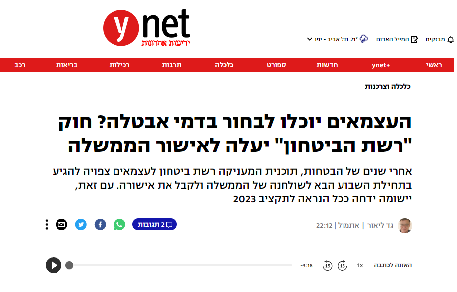 אתר YNET מדווח: ״התוכנית לרשת ביטחון לעצמאים שגיבשה לשכת יועצי המס בשנת 2015 ואותה קידם כעת סגן השר אביר קארה, תעלה ביום ראשון הקרוב לוועדת השרים לענייני חקיקה, כאשר היא זוכה לתמיכת ראש הממשלה, ראש הממשלה החליפי ושר האוצר בזכות פעילותו של קארה בנושא.