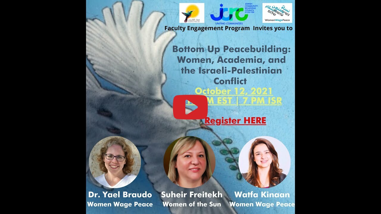 | ב-12.10 השתתפו נציגות של נשים עושות שלום ונציגה של נשות השמש בסמינר-רשת (וובינר) משותף. הצגנו בו את שתי התנועות ואת עבודתנו המשותפת, והזמנו נשות ואנשי אקדמיה לתמוך בעשייה ולהצטרף אליה. הוובינר אורגן על ידי Jewish Community Relations Council of New York, בשיתוף עם אוניברסיטת קולומביה בניו יורק ומוסדות אקדמיים נוספים. מאות צופות וצופים בוובינר ובשידור ברשתות החברתיות שמעו את סוהייר פרייטך מרמאללה, נציגת תנועת נשות השמש, מספרת על הקמת התנועה, על מקור שם התנועה והלוגו שבחרו, על ההשראה שקיבלו מנשים עושות שלום ועל החיבור ההדוק בין שתי התנועות בדרך המשותפת לשלום. כדי לצפות בהקלטת המפגש הקישו על תמונת הסרטון פה למטה. |
