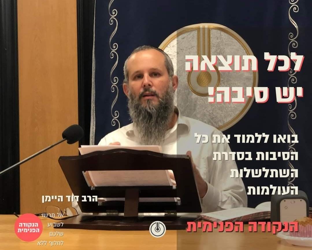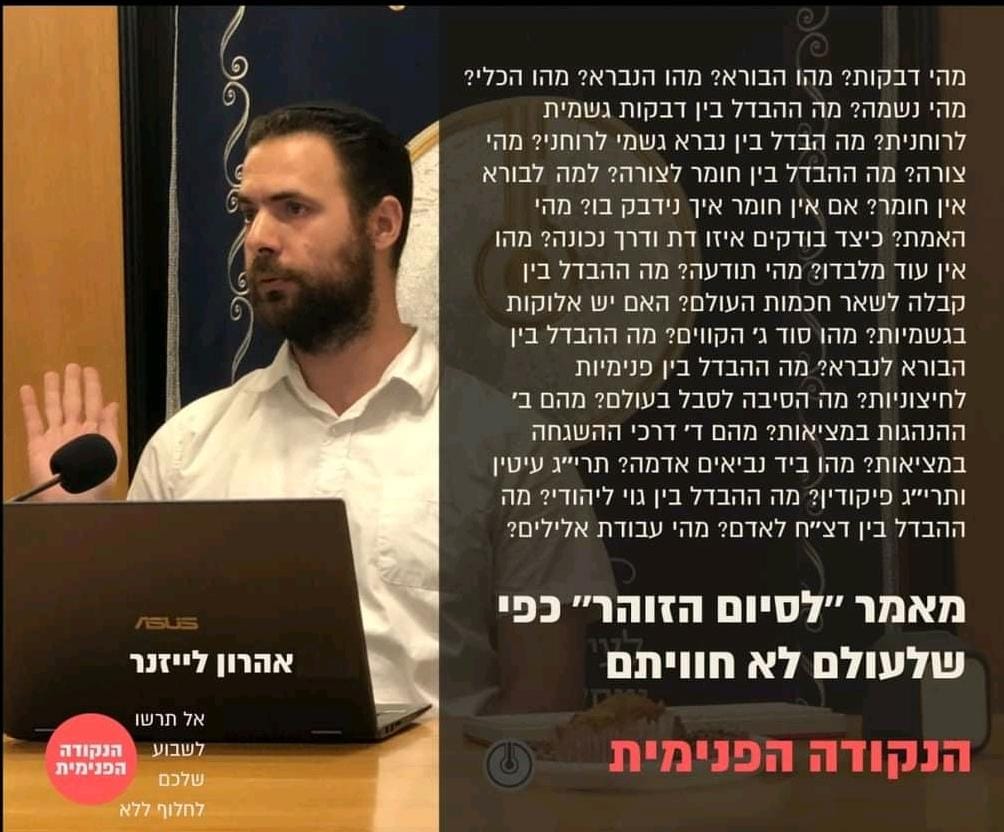 | בואו להיפגש עם אנשים שהנקודה הפנימית מוציאה אותם מהבית! ️ מסגרת חדשה, מלאת תוכן העוסקת ביסודות ההשקפה, פירוש התורה על דרך הפנימיות כלים לעבודת נפש, עולמות רוחניים וסדריהם ועוד — והכל בתוך שעתיים רצופים של תורה.
