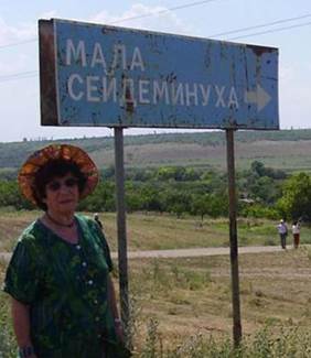 זו אמי, מתחת לשלט בכניסה למושבה בה נולד אביה. |