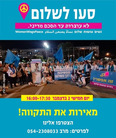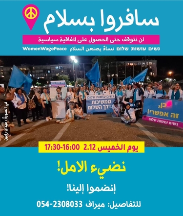 | | ידיעון נובמבר 2021 ️نشرة اخبار تشرين ثاني ٢٠٢١ כסלו תשפ"ב | | שלום החודש התחדשה הפעילות שלנו בכנסת, וכללה שלשה ארועים שונים! עוד בידיעון הפעם על פגישה מרגשת בבית שגריר שבדיה, על הפעילות שלנו בשבוע הסובלנות בירושלים, על המאבק באלימות של חברתנו כיפאיה עיאיטי, ולסיום הזמנה להצטרף אלינו בצמתים להאיר את התקוה. אבל לפני הכל ברכתנו לחג: | | כנסת 1: חוזרות לכנסת البرلمان ١: نعود للكنيست | | שלוש שנים, ארבע מערכות בחירות, קורונה אחת - ואנו בשלנו. הלבן והטורקיז חוזרים וממלאים את המסדרונות והמליאה. נפגשנו ביום שלישי ה-16 בנובמבר עם חברת הכנסת גבי לסקי ממר"צ שאמרה: ״אתן מיישמות באופן הטהור ביותר את מגילת העצמאות שקוראת להושיט את היד לשלום״. חזרנו כדי להזכיר שאנחנו לא עוצרות עד הסכם מדיני ושנעשה הכול כדי שהכנסת הזאת תהיה הכנסת שתאשר את ההסכם המדיני המיוחל. | | | כנסת 2: כנס חוק חלופות מדיניות תחילה البرلمان ٢: مؤتمر قانون الحلول السياسية أولًا