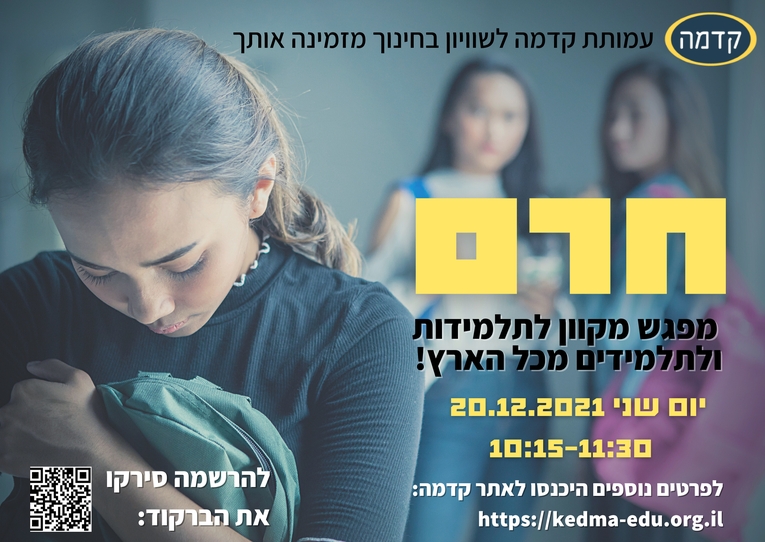 | בתאריך: 20/12/2021, יום שני, 10:00-11:15 נקיים זום בנושא חרם בכיתה/בבית הספר זה נושא שתמיד רלוונטי, לאחרונה אפילו יותר במסגרת גלי האלימות שפוקדים אותנו, וחשוב לאפשר לתלמידות/ים לדבר עליו. . מה יהיה בזום? - נפגוש תלמיד/ה שחוו חרם ויספרו על החוויה, על ההשפעות שלה ומה בחרו לעשות עם זה אח"כ.
