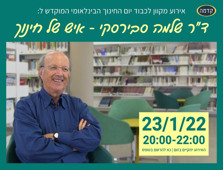 | אנחנו מזמינות אותך להצטרף אלינו לאירוע זום חגיגי לכבוד יום החינוך הבינלאומי שמוקדש לדמותו ולפועלו של ד"ר שלמה סבירסקי: הוגה, אקטיביסט, איש חינוך ואחד מהמייסדים המרכזיים של ביה"ס קדמה ועמותת קדמה. . האירוע יתקיים ביום שני הקרוב 23.1.2022 בין השעות 20:00-21:30 - נצפה בסדרת סרטונים קצרצרים מרשמיו של שלמה על החינוך כיום.