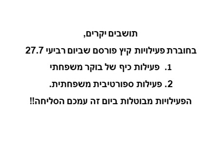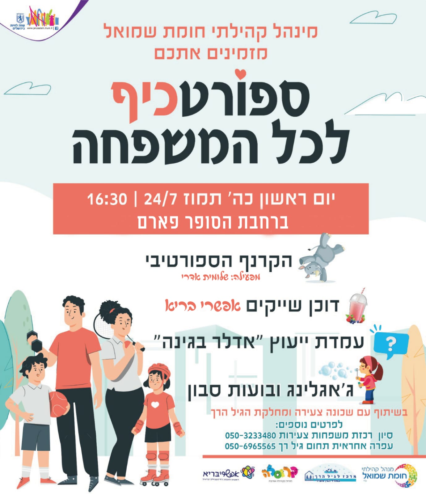 יום ראשון 24.7 הפעילות תתקיים ברחבת הסופרפארם 17:00-19:00