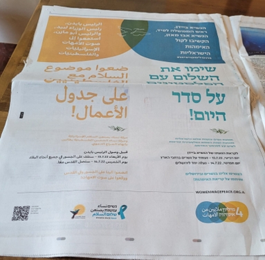 • פרסמנו מודעות ענק בעיתונות בעברית ובאנגלית: שימו את השלום בין ישראל והפלסטינים על סדר היום!
