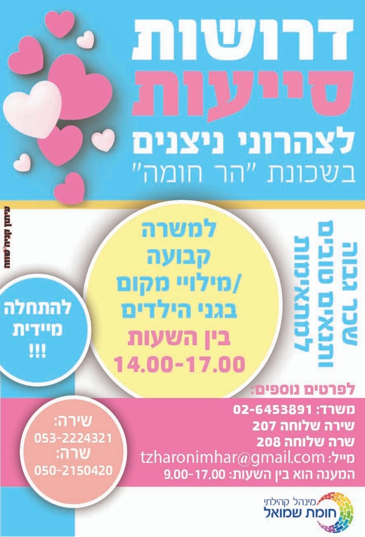 | אנחנו מחפשים אותך! להצטרף לצוות משפחתי, במגוון תפקידים. דרישות סף- אהבה וברק בעיניים בעבודה למען הקהילה. פרטים מלאים באתר המינהל |