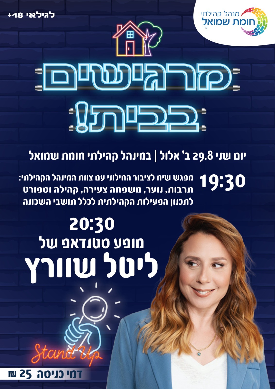 | נפגשים במינהל הקהילתי ביום שני ה- 29.8. בשעה 19:30 מפגש שיח עם צוות המינהל הקהילתי: תרבות, נוער, משפחה צעירה, קהילה וספורט לתכנון הפעילות הקהילתית. בשעה 20:30 מופע סטנדאפ של ליטל שוורץ. מהרו להזמין כרטיסים בקישור מחכים לכם! https://bit.ly/3JRjTou |