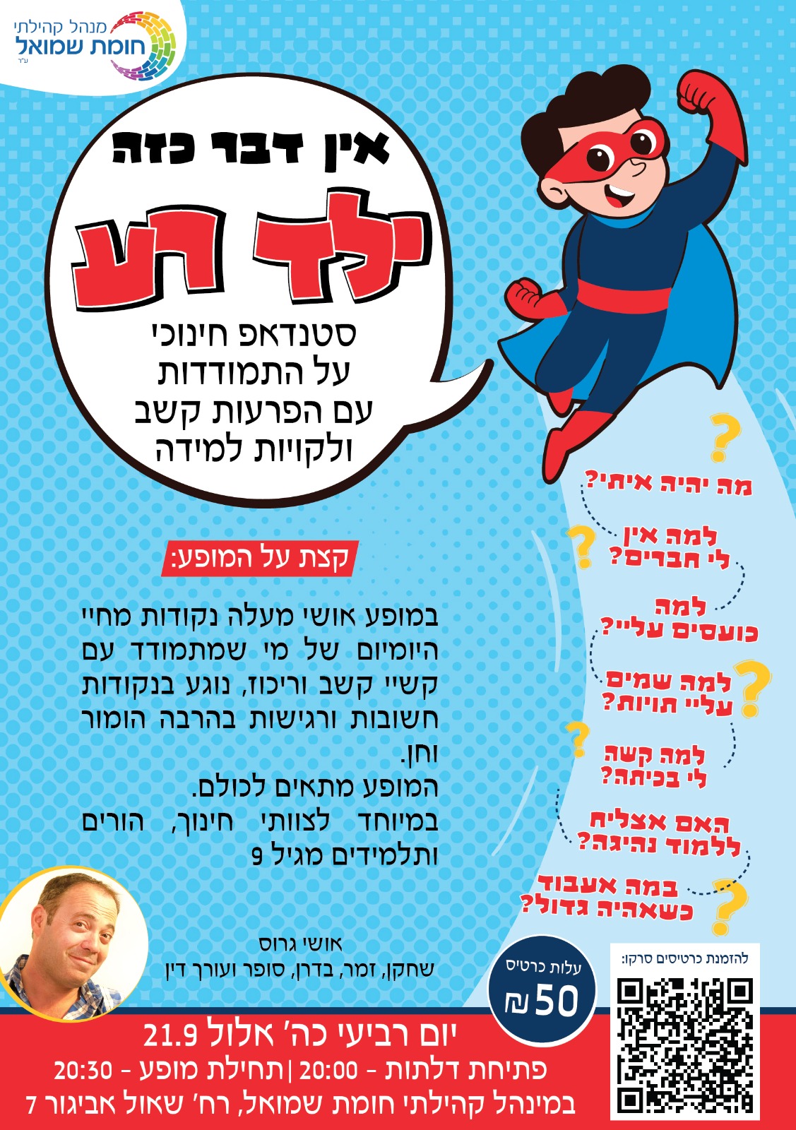 | אושי גרוס - שחקן, זמר, סופר ועורך דין יום רביעי | כה' אלול | 21.9 פתיחת דלתות : 20:00 תחילת מופע: 20:30 במינהל הקהילתי חומת שמואל לרכישת כרטיסים - https://hstickets.lineapp.co.il/p/אין_דבר_כזה_ילד_רע |