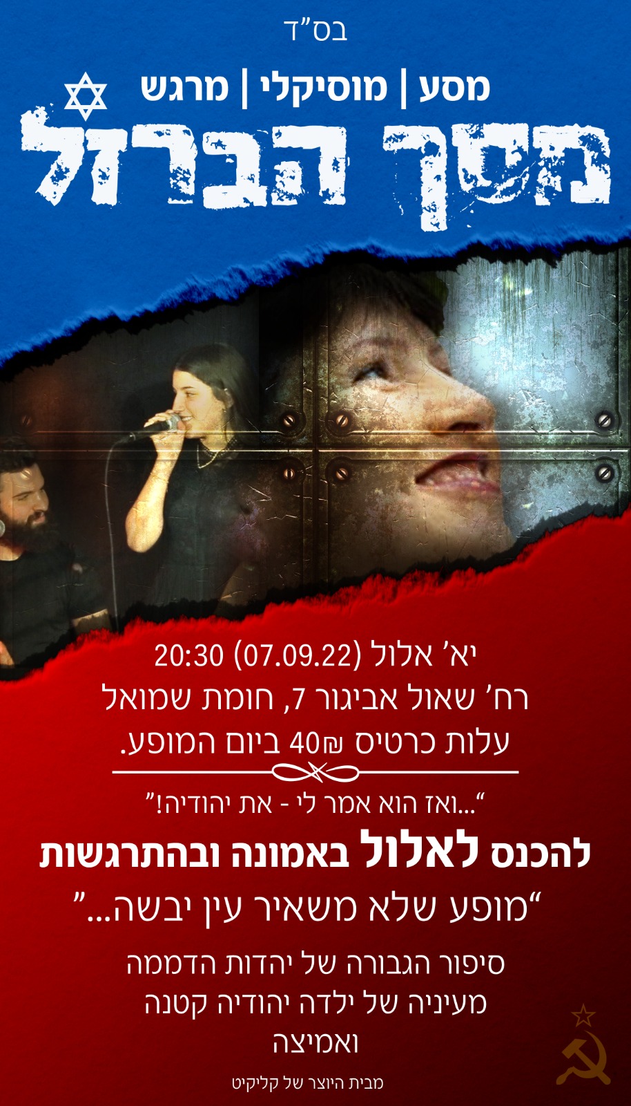 | יום רביעי | 7.9 | יא' אלול בשעה 20:30 עלות כרטיס ביום המופע - 40 ש"ח https://tickchak.co.il/31953?ref=nwc סיפור הגבורה של יהדות הדממה מעיניה של ילדה יהודיה קטנה ואמיצה |